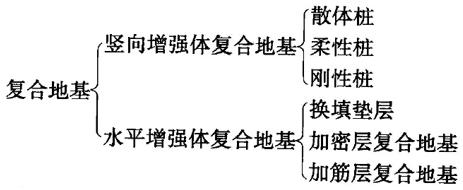 广义上讲,不管采用什么方法对地基加密、加固和加筋,都使地基成为两种不同部分:一种是天然的原状土;另一种是经加密、加固、加筋的增强体。这就由增强体和周围地基土共同承担荷载,形成复合地基。不管是预压加密、强夯加密、换填垫层、加筋垫层,还是各类置换桩、挤密桩、振冲桩、柱锤冲扩桩、各类含胶结材料形成的桩,都可以形成复合地基。因而除少量单纯为了防渗用的地基处理外,都可以认为经处理后的地基都形成复合地基。前一类可称为横向增强体复合地基,其作用是扩散荷载,类似垫层作用;后一类为竖向增强体复合地基,也可称为桩式复合地基。按照桩的材料及刚度,又有人分为散体桩、柔性桩和刚性桩复合地基,亦即: